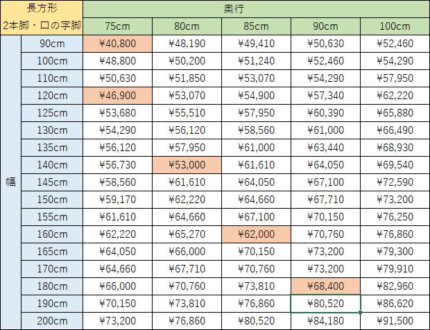 長方形テーブルは幅90〜200cm、奥行75〜100cm間でそれぞれサイズオーダーできます。