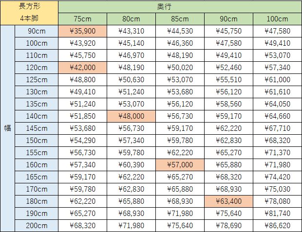 長方形テーブルは幅90〜200cm、奥行75〜100cm間でそれぞれサイズオーダーできます。