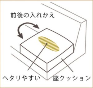 長持ち高密度ウレタン(ヘタリ・凹み軽減)を使用した座クッションは、定期的に前後の入れ替えを行うことで長くお使い頂けます。 |