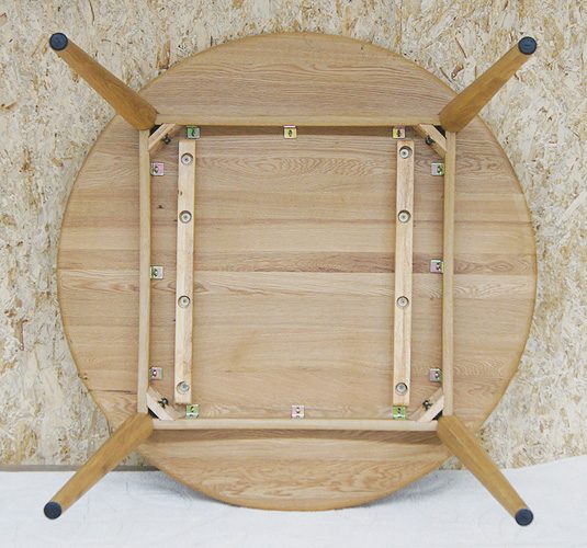 ←天板裏側 天然木は呼吸しつづけていますので、反りなどが起こらない様にするために、天板裏側に反り止めを2本(写真の矢印)設置しています。 |