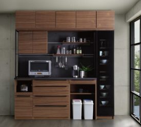 | パモウナ EC/EMシリーズ(パールホワイト・セラミカネロ・ウォールナット) カウンター高さ:938/848mm 奥行き:500/445mm 高さ:1,975/1,885mm 上置き付き:2,185〜2,575/2,095〜2,485mm 展示はセラミカネロ色となります。 |